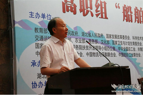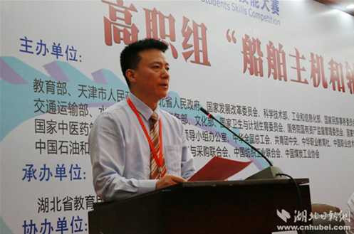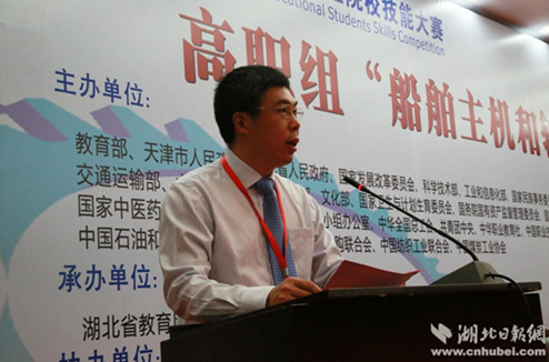 湖北分赛区组委会委员、湖北省教育厅职成处处长邓世民在会上讲话。他表示在我省贯彻落实国家《关于加快发展现代职业教育的决定》,深入实施《湖北省教育事业发展“十三五”规划》,向职业教育强省迈进的重要历史时刻,我省再次承办“船舶主机和轴系安装”赛项,将为推动我省职业院校技能大赛创新发展、促进高职教育“双一流”建设增添新动力。
