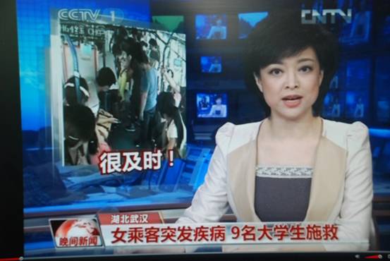 6月15日晚10点多,中央电视台综合频道《晚间新闻》栏目,以《女乘客突发疾病 9名大学生施救》为题,报道了6月13日发生在801公交车上我院9名学子救助突发疾病女乘客的事迹。报道画面打出“很及时”三个大字,主持人在节目中说“感谢这几位素不相识的可爱的年轻人。”