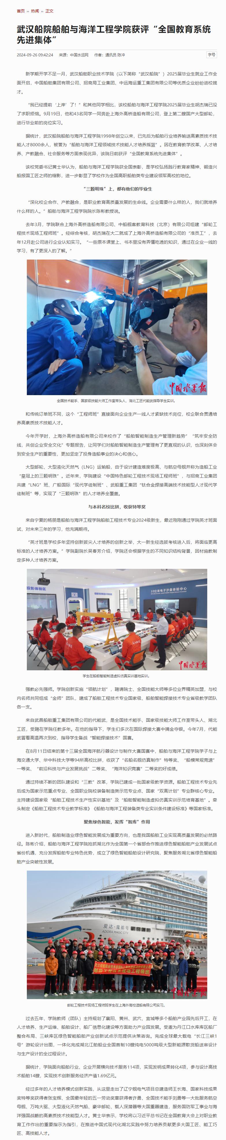中国水运网:武汉船院船舶与海洋工程学院获评“全国教育系统先进集体”