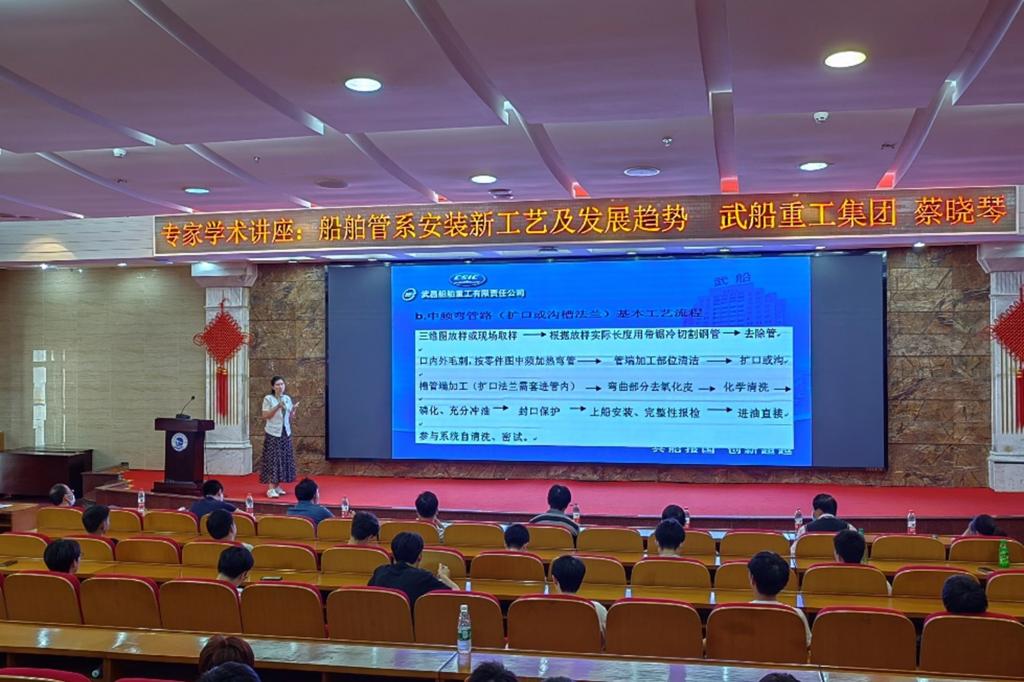 本网讯 5月15日下午,交通运输工程学院在学术报告厅举办船舶领域新技术新工艺专题讲座,邀请武昌船舶重工集团总工艺师蔡晓琴高级工程师作《船舶管系安装新工艺及发展趋势》专题讲座。交通学院党总支书记张辉主持活动,“双高”专业群轮机工程技术、内燃机制造与应用技术、舰船动力工程技术相关专业课老师、实训老师及百余名学生参加讲座学习。