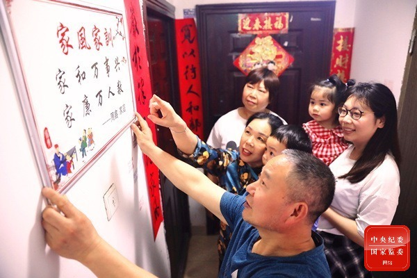 重庆市铜梁区纪委监委把家风建设作为清廉铜梁建设的重要内容,以家训传廉、家风倡廉、家庭助廉、阵地宣廉等形式,培育廉洁家风,涵养清风正气。图为该区居民在家门口张贴廉洁家训。(重庆市铜梁区纪委监委 马冬晓 摄)
