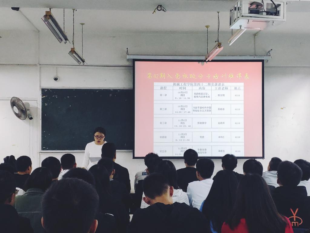 为进一步提高我院入党积极分子素质,机械工程学院学生党支部于2019年10月24日下午18点在4108教室举行第42期入党积极分子党课培训班开班仪式。参加开班仪式的有:党总支副书记郑丽萍同志、学生党支部书记赵平飞同志以及第42期入党积极分子党课培训班全体学员。开班仪式由赵平飞同志主持。