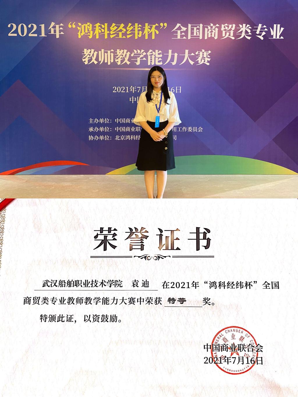 本网讯 7月16日,2021年“鸿科经纬杯”全国商贸类专业教师教学能力大赛在厦门圆满闭幕,商务贸易学院市场营销专业教师袁迪充分准备、沉着应战,获得该项竞赛的特等奖。本次大赛是由中国商业联合会主办的国家级行业赛项,共有来自全国各地63所院校90余名教师参赛。