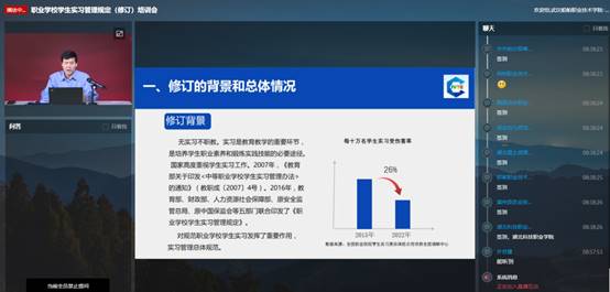 本网讯4月20日上午9:00-12:00,根据省教育厅《关于组织参加<职业学校学生实习管理规定(修订)>专题培训的通知》要求,我院187名教师在线上参加了由教育部组织的“《职业学校学生实习管理规定(修订)》专题培训会”。