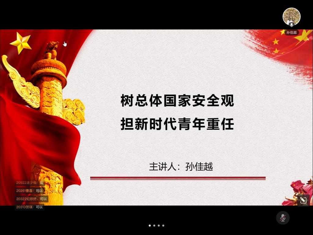 本网讯 为深入推进“青年马克思主义者培养工程”,提高大学生骨干思想政治素养,进一步增强国家安全的责任感、义务感和荣誉感。4月24日上午,由院团委挂职副书记马克思主义学院专职教师孙佳越在腾讯会议为第四期“青马工程”精英班学员讲授主题为“树总体国家安全观,担新时代青年重任”线上课程。