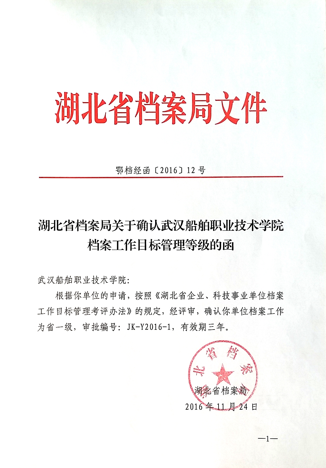 2016年11月24日,湖北省档案局正式下文,批准我院档案工作目标管理晋升省一级,我院成为首个由湖北省档案局按新标准评审通过的省一级验收单位。