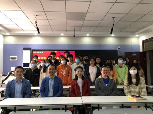 本网讯 3月16日上午,商务贸易学院在1309智慧教室举办广东坚朗五金制品股份有限公司校企合作订单班开班典礼,这是我院与上市公司、制造类实体企业校企深化合作的新成果。坚朗公司企业专家卢业政、钟广生,商务贸易学院院长赵亮、党总支副书记何欢、辅导员张梦姝、占令和订单班的同学们一起参加了开班仪式。