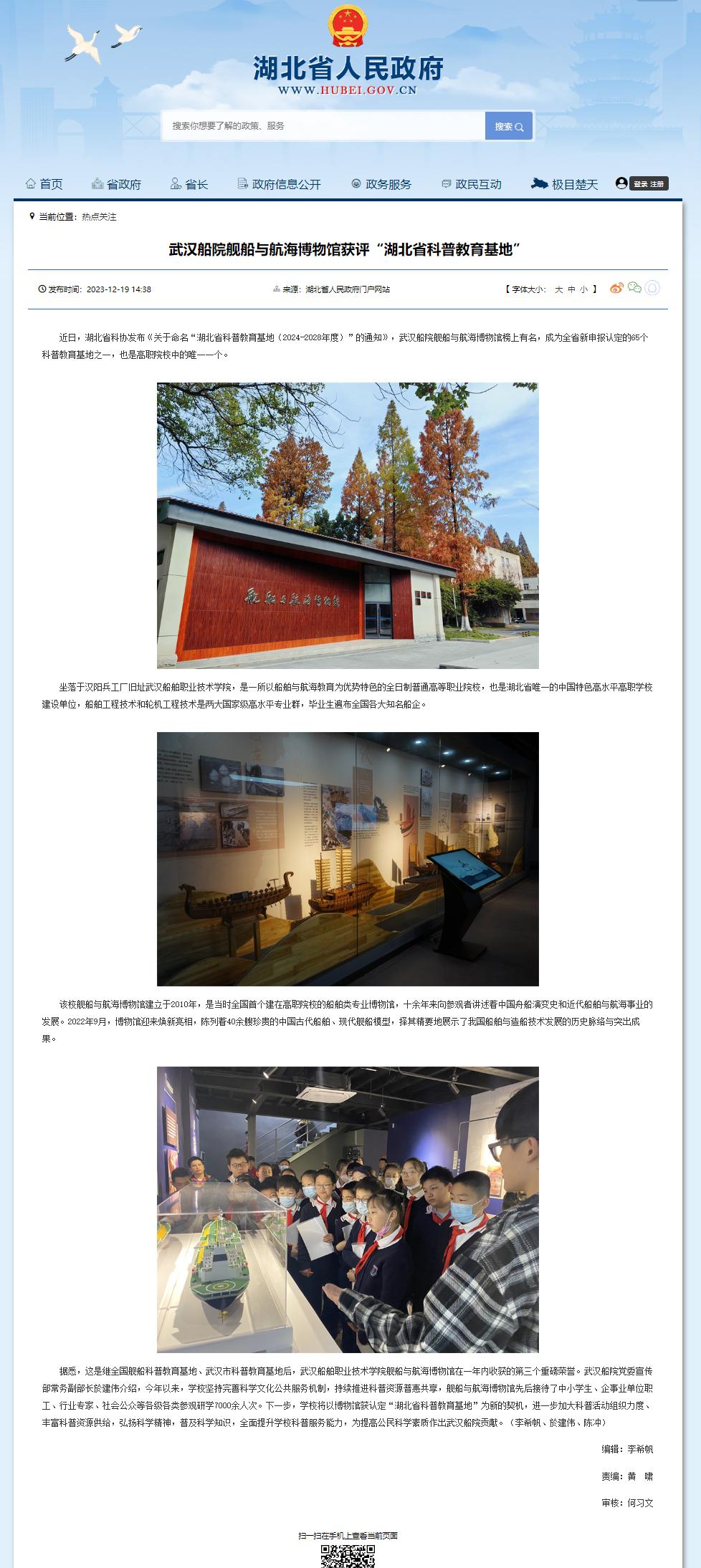 湖北省人民政府网:武汉船院舰船与航海博物馆获评“湖北省科普教育基地”